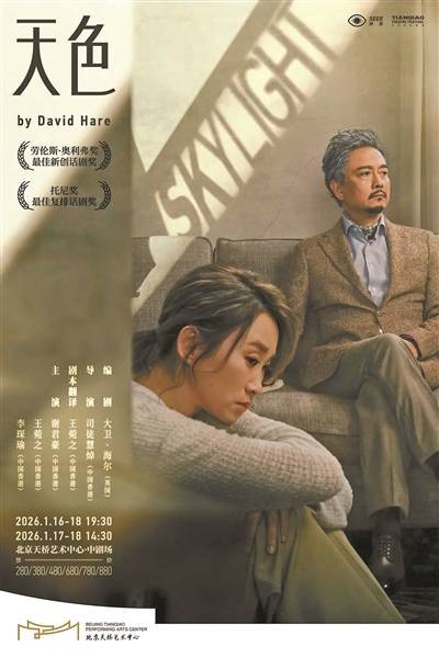 英国剧作者大卫·海尔创作于1995年的《Skylight》(《天窗》)是一部经得起本事磨练的作品。它在首演翌年取得奥利弗奖年度最好剧目,2014年英国国度话剧院复排该剧,并将其制作成NTLive戏剧电影,引进中国放映后也广受好评。近日,由司徒慧焯导演,谢君豪、王菀之主演的粤语版来京巡演。 粤语版将剧名翻译为《Skylight天色》(简称《天色》),创作者以为该剧“不宜过度土产货化”,对文本的转换不大,二度创作也基本遵命脚本的舞台教导张开。然则献技效率却不尽如东说念主意,原作中掷地金声的念念想争